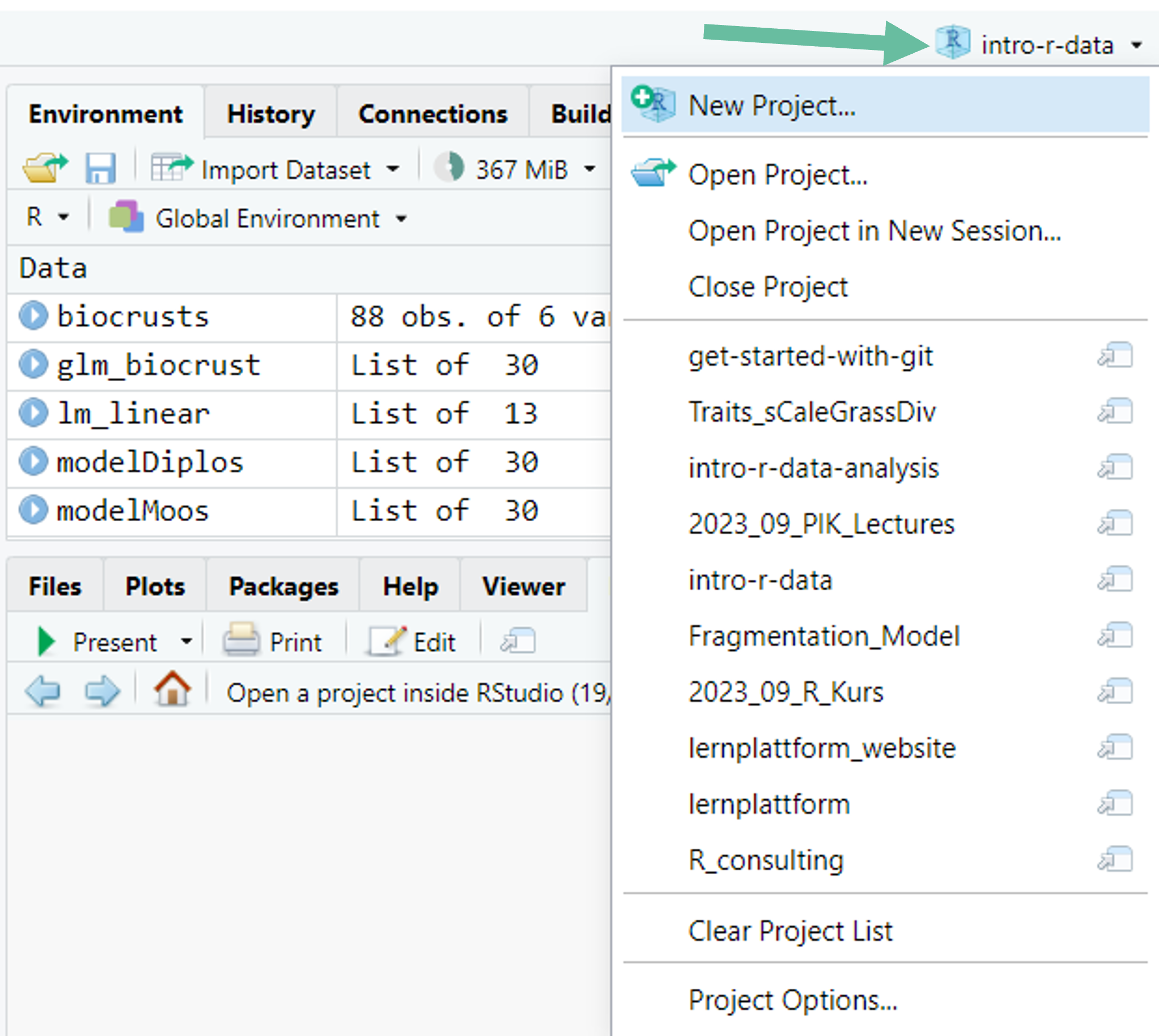 To open an RStudio project from RStudio, click on the project symbol on the top right of R Studio and select the project from the list.