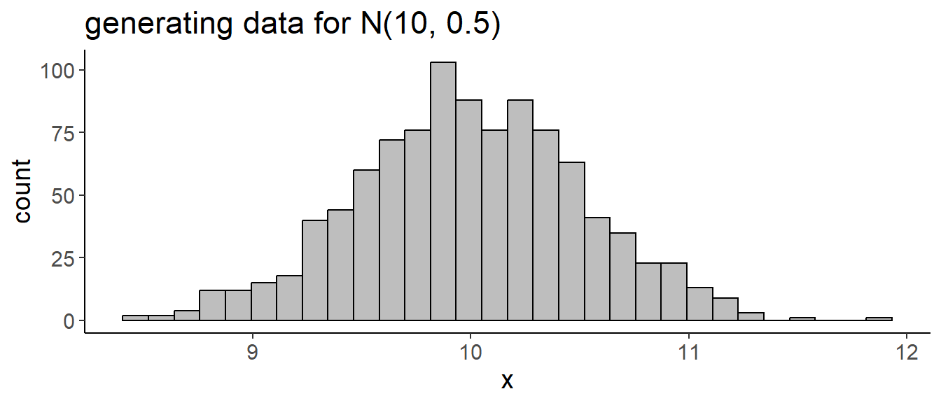 df <- tibble(x = rnorm(1000, mean = 10, sd = 0.5))