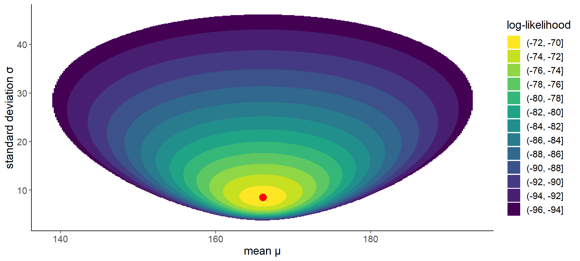 labs(x = "mean μ", y = "standard deviation σ", fill = "log-likelihood") +