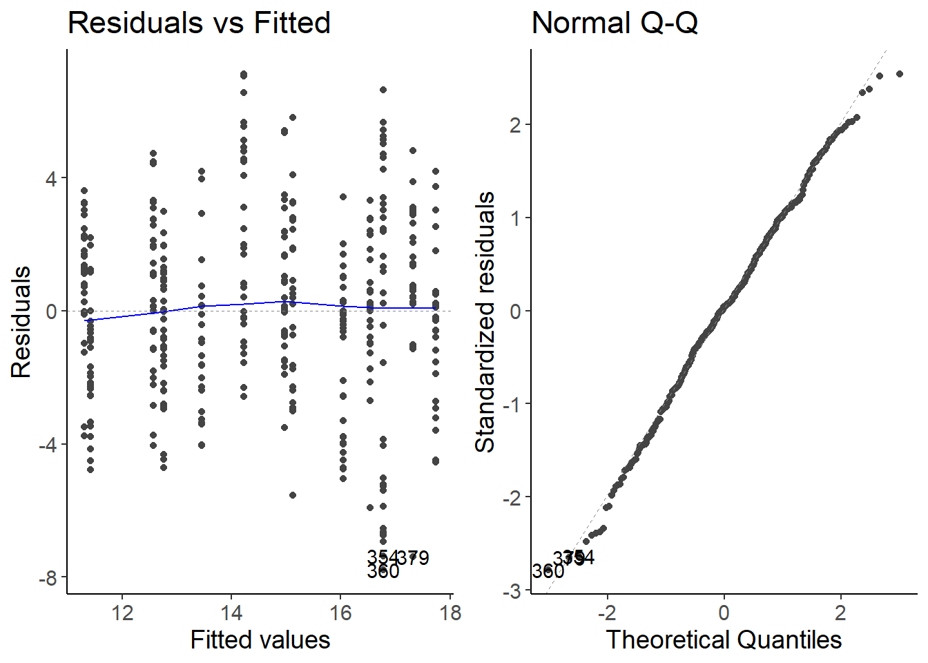 ## fit linear modellm1 <-lm(size ~ latitude + water_temp, data = df_crabs)## check model assumptionsautoplot(lm1, which =1:2)