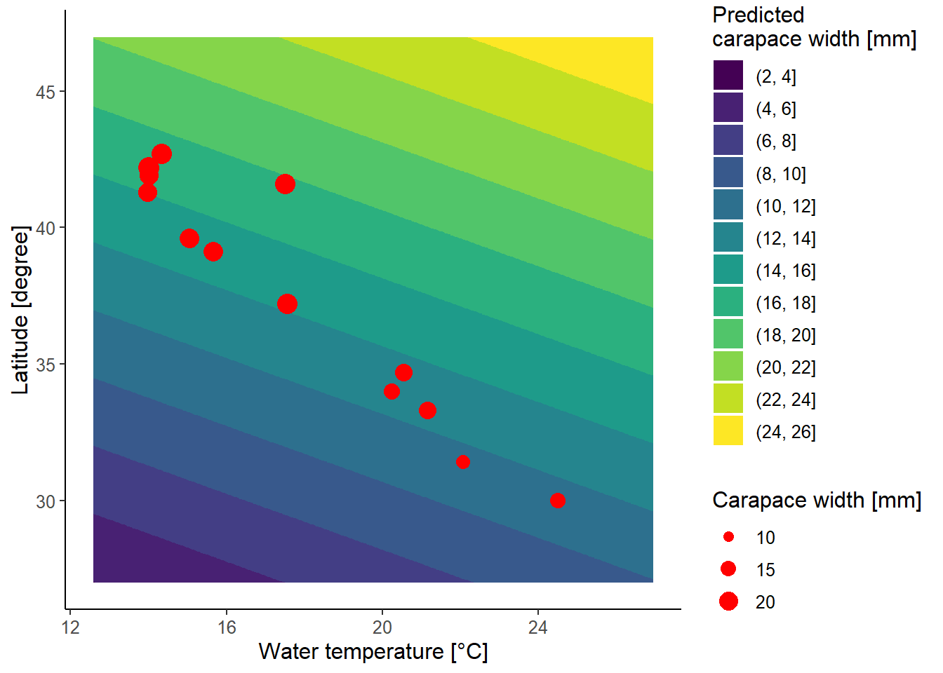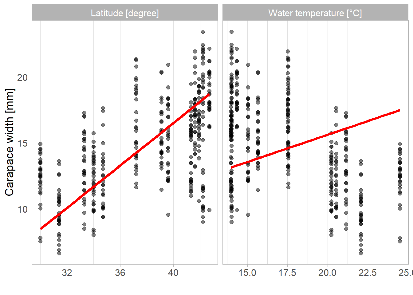 ## make and plot marginal effects# create tibbles with predictionsdf_lat <-tibble(latitude =seq(min(df_crabs$latitude), max(df_crabs$latitude), length.out =30),water_temp =mean(df_crabs$water_temp)) %>%mutate(size =predict(lm1, newdata = .)) %>%select(-water_temp) %>%mutate(name ="Latitude [degree]") %>%rename(x = latitude)df_watertemp <-tibble(latitude =mean(df_crabs$latitude),water_temp =seq(min(df_crabs$water_temp), max(df_crabs$water_temp), length.out =30)) %>%mutate(size =predict(lm1, newdata = .)) %>%select(-latitude) %>%mutate(name ="Water temperature [°C]") %>%rename(x = water_temp)df_pred <-bind_rows(df_lat, df_watertemp) # bring original data into long data formatdf_plot <- df_crabs %>%select(size, latitude, water_temp) %>%pivot_longer(c(latitude, water_temp), values_to ="x") %>%mutate(name =factor(name, levels =c("latitude", "water_temp"),labels =c("Latitude [degree]", "Water temperature [°C]")))# plot marginal effectsggplot(df_pred, aes(x = x, y = size)) +geom_point(data = df_plot, size =2, alpha =0.5) +geom_line(color ="red", linewidth =1.5) +facet_wrap(~ name, scales ="free_x") +labs(x ="", y ="Carapace width [mm]") +theme_light() +theme(text =element_text(size =14))