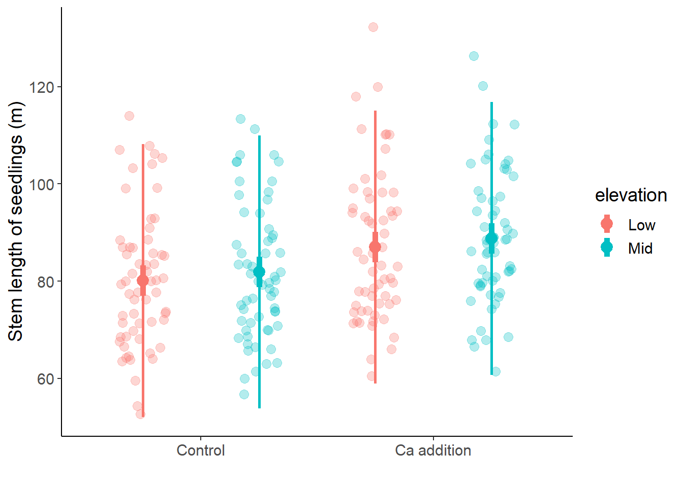 ## load packageslibrary(readr)library(dplyr)library(tidyr)library(ggplot2)library(ggfortify)## theme for ggplottheme_set(theme_classic())theme_update(text =element_text(size =14))## read datadf_maples_prep <-read_csv("data/06_maples.csv")## filter out missing values and rename factor levels## and select columnsdf_maples <- df_maples_prep %>%mutate(calcium_addition =factor(watershed, levels =c("Reference", "W1"),labels =c("Control", "Ca addition"))) %>%select(stem_length, elevation, calcium_addition)df_maples