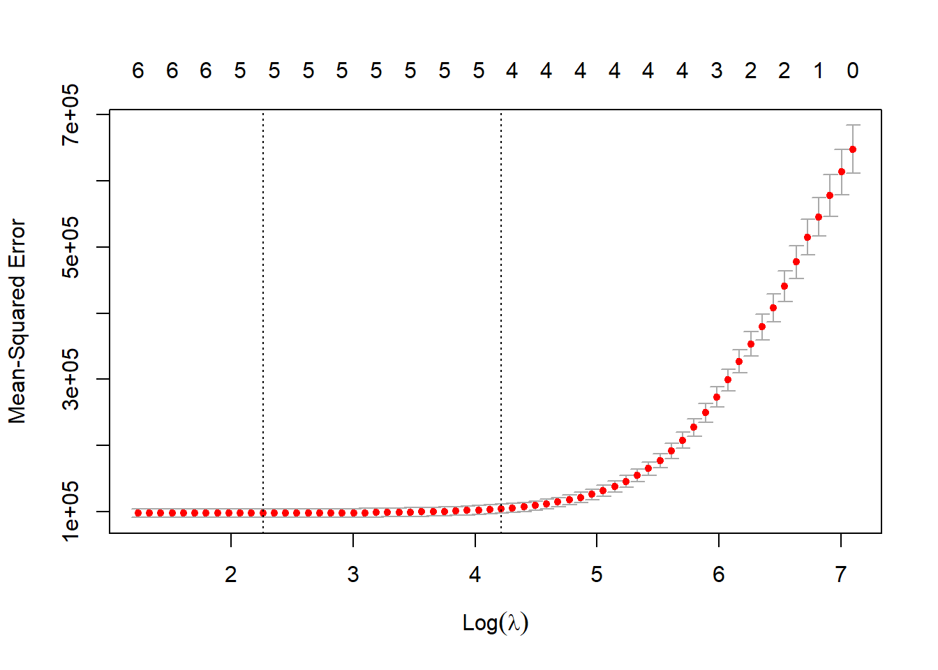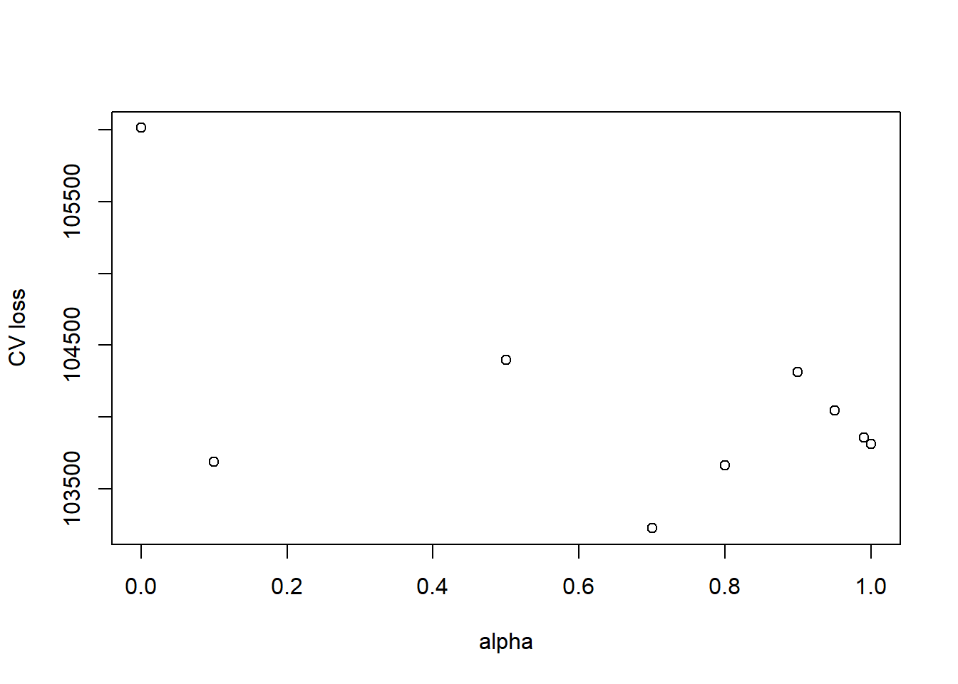 ## compare coefficients, we need to change the contrast coding to sum contrasts!contr_species_sex <-contr.sum(6)colnames(contr_species_sex) <-levels(df_penguins$species_sex)[1:5] contrasts(df_penguins$species_sex) <- contr_species_sexlm_OLS_sum_contrast <-lm(body_mass_g ~ species_sex + year_c,data = df_penguins)elasticnet_cv_sum_contr <-cv.glmnet( body_mass_g ~ species_sex + year_c, alpha = selected_alpha,data = df_penguins, nfolds =15,use.model.frame = T)tibble(names =names(coef(lm_OLS_sum_contrast)), OLS =coef(lm_OLS_sum_contrast),ElasticNet =as.numeric(coef(elasticnet_cv_sum_contr, s ="lambda.1se", alpha = selected_alpha)))