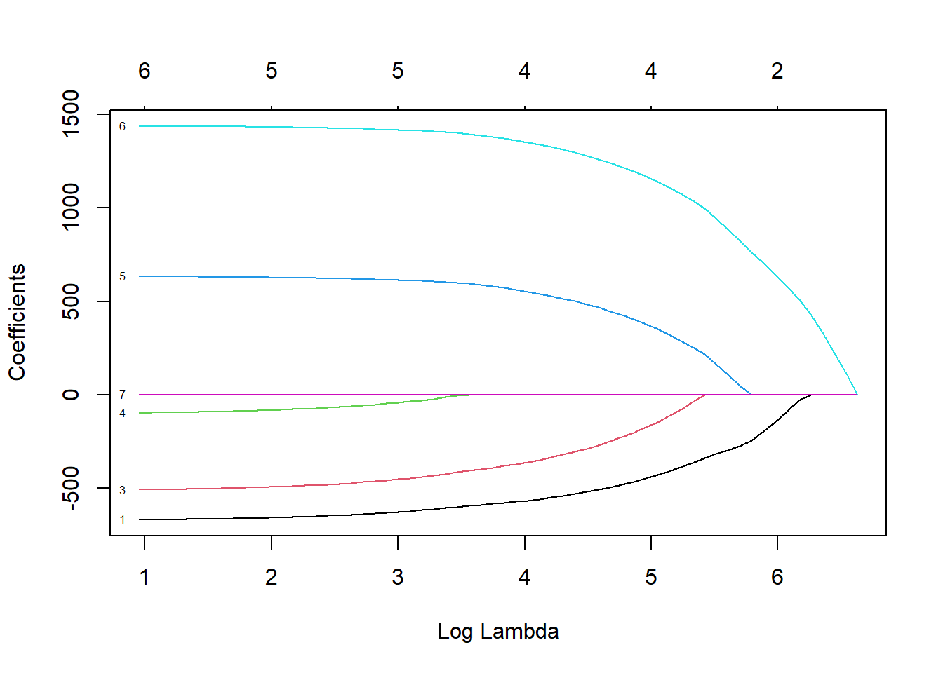 selected_alpha <-0.8## visualize the effect of lambda on the coefficients of the predictor variableselasticnet_single <-glmnet(body_mass_g ~ species_sex + year_c, data = df_penguins, alpha = selected_alpha) plot(elasticnet_single, xvar ="lambda", label = T)