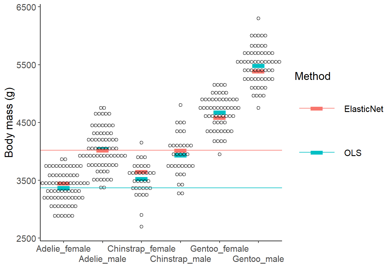 ## make predictionsdf_pred <-expand_grid(species_sex =unique(df_penguins$species_sex),year_c =unique(df_penguins$year_c)) %>%mutate(year = year_c +mean(df_penguins$year), OLS =predict(lm_OLS, newdata = .),ElasticNet =predict(elasticnet_cv, newdata = ., s ="lambda.1se", alpha = selected_alpha,use.model.frame = T)[,1]) %>%select(-year_c) %>%pivot_longer(c(OLS, ElasticNet), names_to ="method", values_to ="body_mass_g") df_hline <-tibble(y =c(coef(elasticnet_cv, s ="lambda.1se", alpha =0.9)[1,1], coef(lm_OLS)[1]),method =c("ElasticNet", "OLS"))ggplot(df_pred, aes(species_sex, body_mass_g)) +geom_point(aes(color = method),shape ="-", size =20) +geom_dotplot(data = df_penguins,binaxis ="y", dotsize =0.5, stackdir ="center", alpha =0.7,fill =NaN) +geom_hline(aes(yintercept = y, color = method), data = df_hline) +scale_x_discrete(guide =guide_axis(n.dodge =2)) +labs(x ="", y ="Body mass (g)", color ="Method")