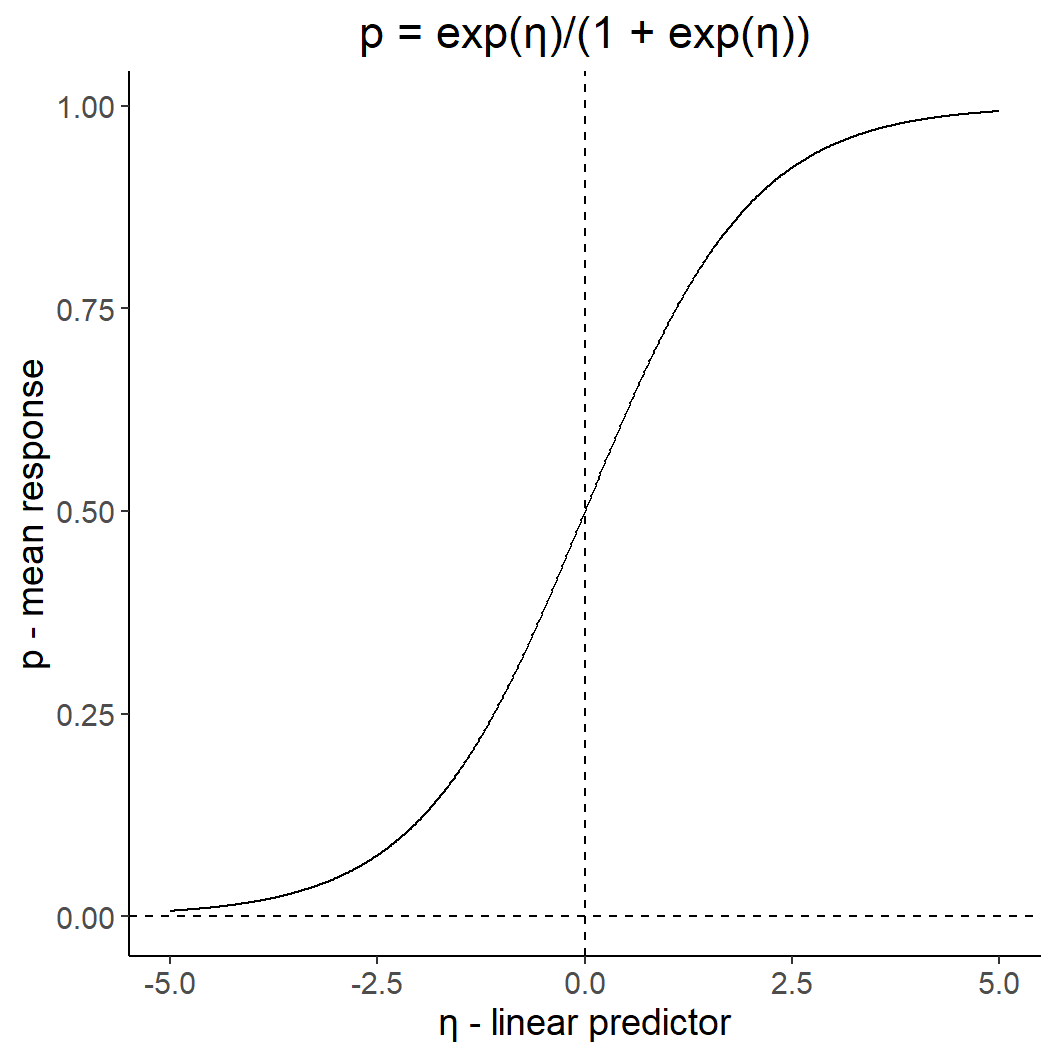 ggtitle("p = exp(η)/(1 + exp(η))") +