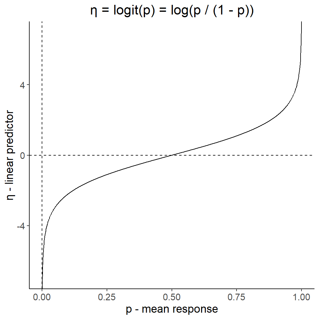 ggtitle("η = logit(p) = log(p / (1 - p))") +