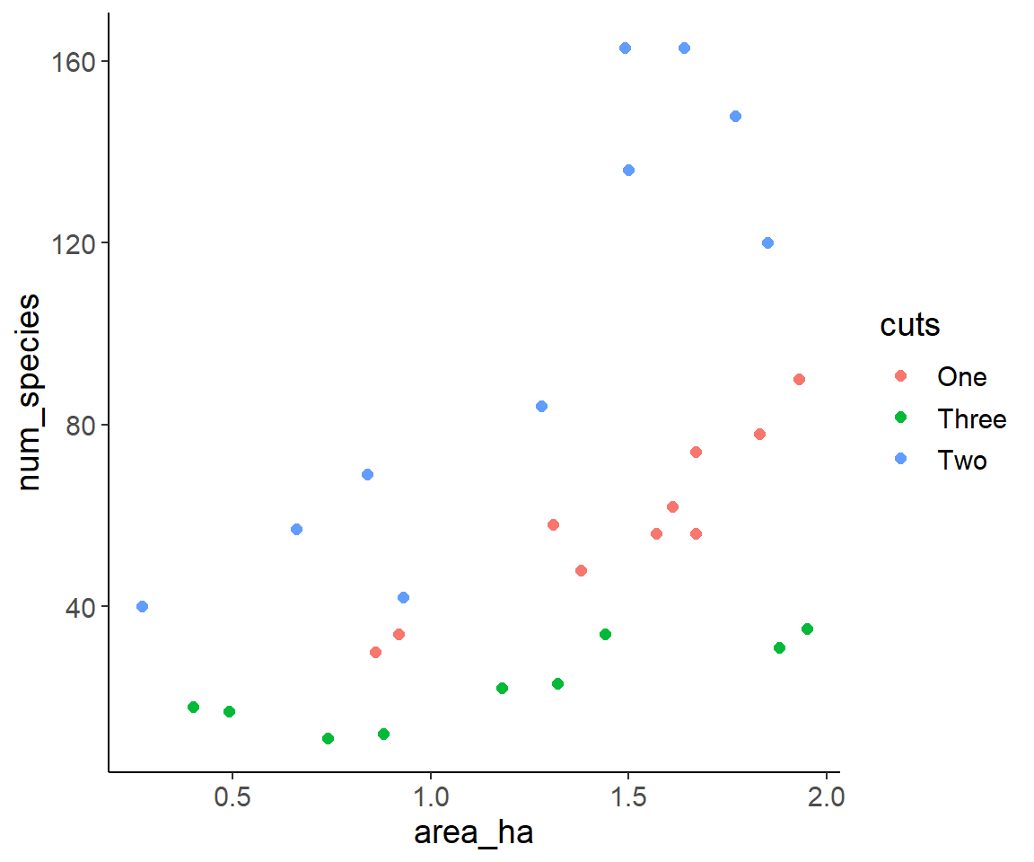 ggplot(insects1, aes(area_ha, num_species, color = cuts )) +