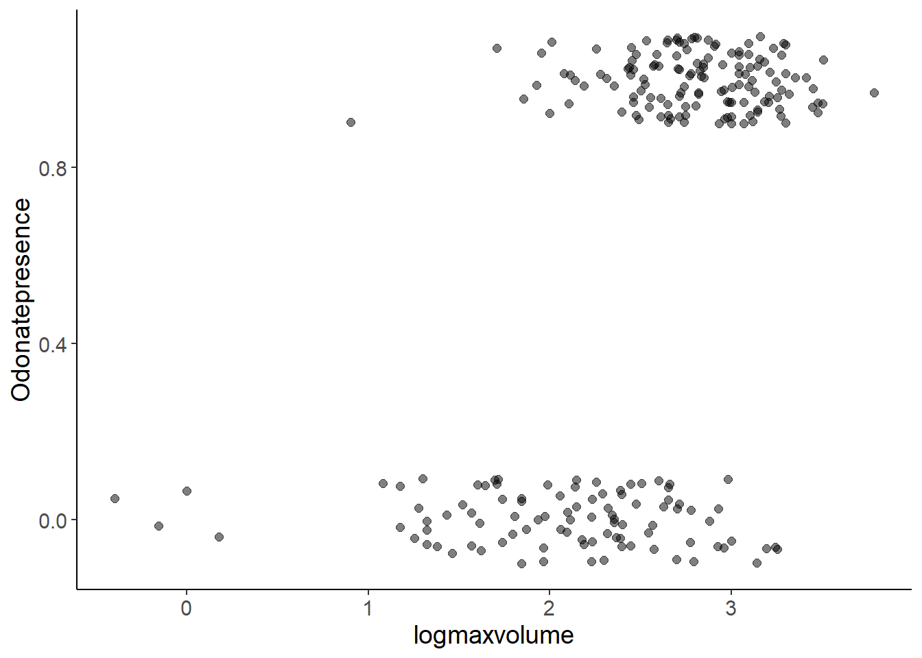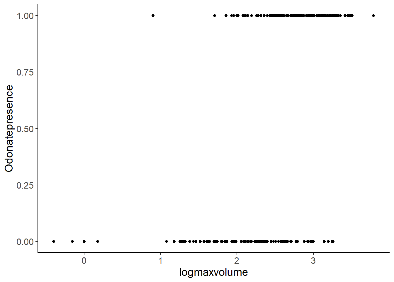 ggplot(bromeliads, aes(x = logmaxvolume, y = Odonatepresence)) +