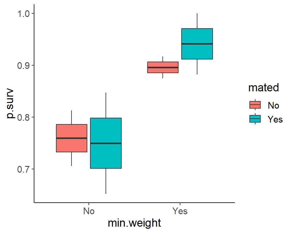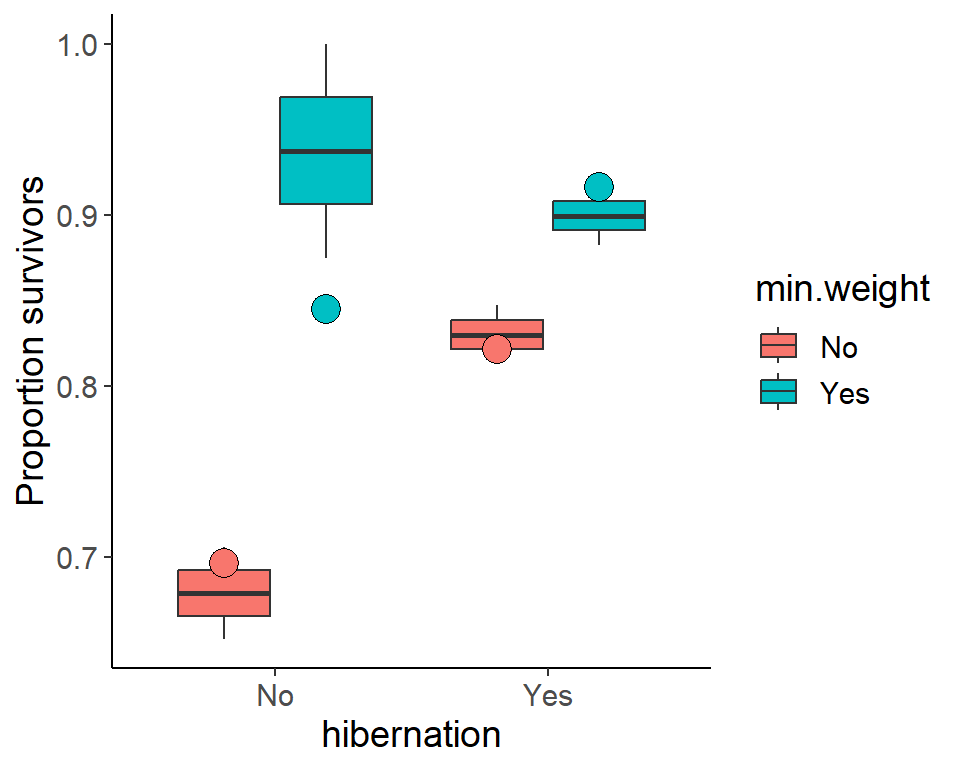 model2 <- glm(cbind(n.surv, n.death) ~ mated + hibernation + min.weight,