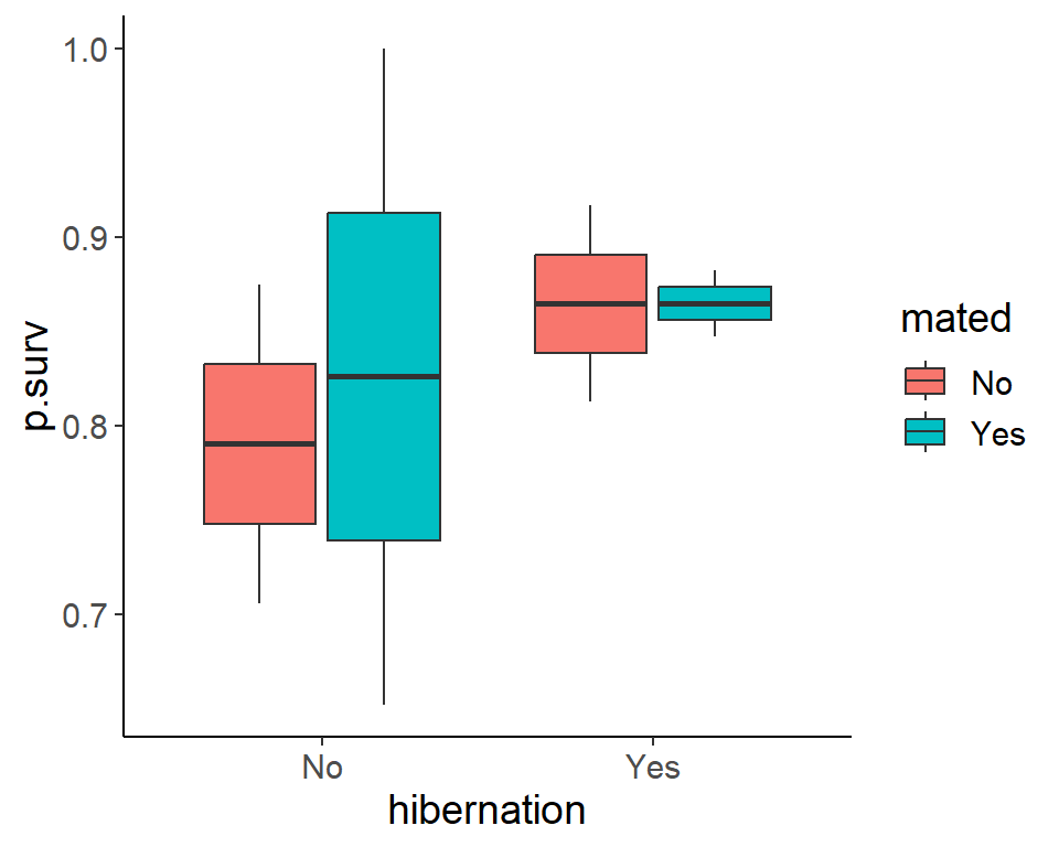 glm(formula = cbind(n.surv, n.death) ~ mated + hibernation +