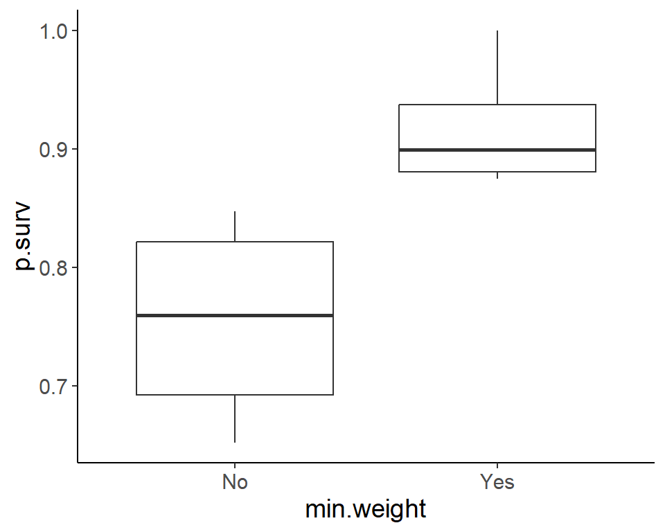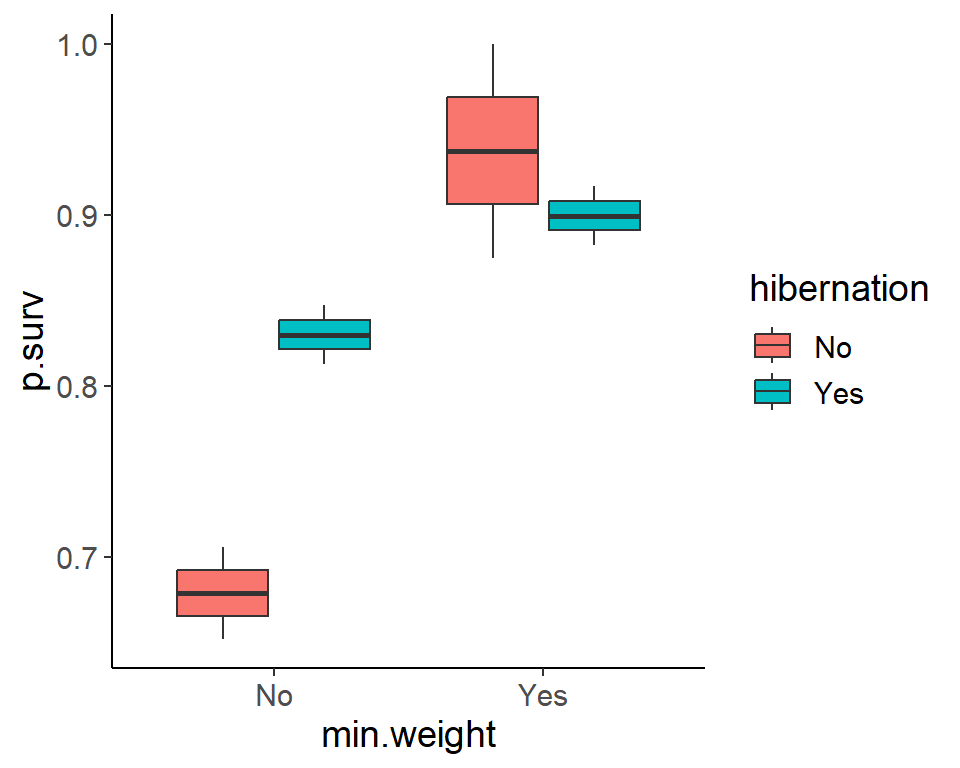 For the predictions, we create a model which includes the significant explanatory variables only and use this model to predict the survival probabilities for all combinations of hibernation and minimum weight.