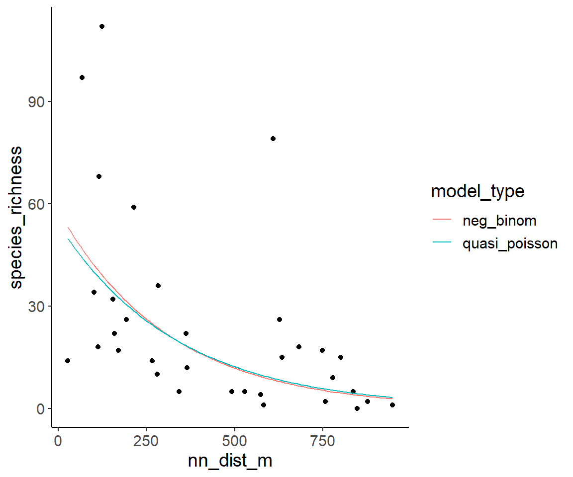 pivot_longer(neg_binom:quasi_poisson, names_to = "model_type", values_to = "species_richness")Now, we can nicely plot the predictions of both models
