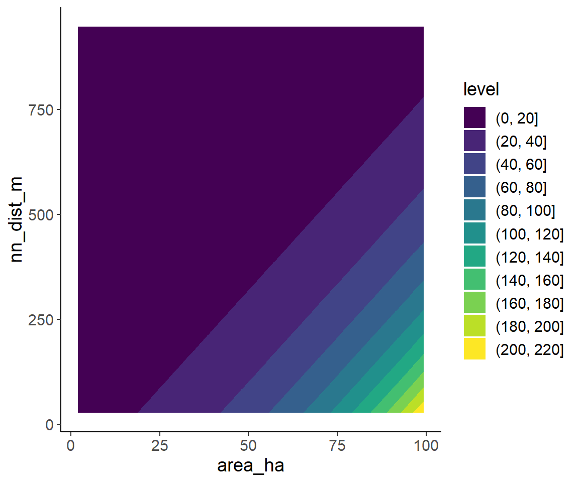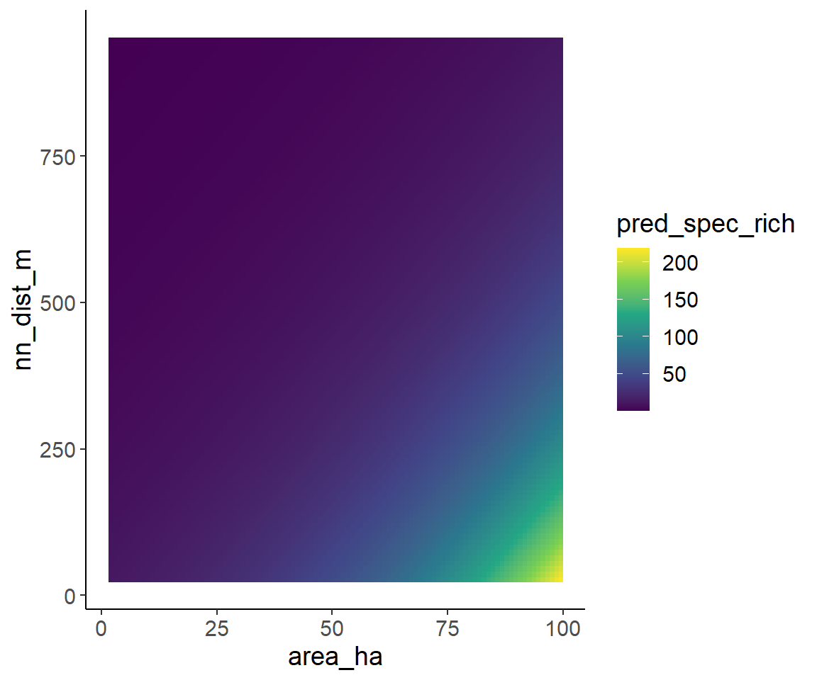 For this purpose, I first generate a grid with many combinations of area and isolation for which predictions are generated. Here, I only use the model with the negative-binomial distributions, but it will work with the quasipoisson model in the same way.